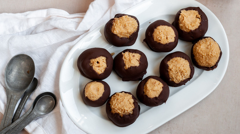 In a way, buckeyes are sort of like Reese's peanut butter cups, but a little more rustic and homemade and therefore a little tastier. The peanut butter base can vary, but it typically just features peanut butter, plain butter, and powdered sugar, a winning trio of impossibly rich and sweet ingredients that make for a decadent bite each and every time. The chocolate shell on the outside is somehow the less-rich factor of the cookie, adding that wonderfully chocolatey contrast that we all know and love. Simple as they may be, buckeyes are an absolute staple in the peanut butter dessert world. Best of all? Buckeyes don't require any baking.