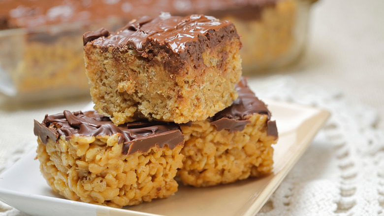 Now, I will assent that scotcharoos aren't nearly as delicious as they could be without that chocolate layer on top, which is a big reason why they don't rank higher on this list. A truly delicious peanut butter dessert should stand on its own in terms of peanut butter flavor, and scotcharoos do to an extent, but the contrasting chocolate coating really takes them to the next level. I appreciate that these little treats are easy to make and have a lot of textural complexity going on, but ultimately, an elevated Rice Krispie treat can only rank so high when compared to other peanut butter desserts.