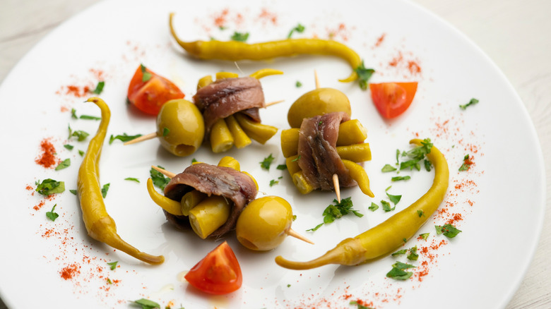 As simple as three ingredients on a toothpick might sound, the handheld pintxo (not to be confused with tapas) features varying flavors and textures that meld for a satisfying bite. Because it's just three ingredients, you'll want high-quality options for the best Gildas. There are also specific types of olives and peppers that should be used to lean into the Spanish origins. Manzanilla olives are usually used — specifically pitted ones so that diners don't have to worry about the seed. If olives don't frequent your kitchen cabinet, here are the best jarred olive varieties to pull it off. Combine them with pickled Guindilla peppers, a small and mild chili pepper grown in Spain. And for the anchovies, use the highest quality you can afford, preferably packed in oil for another layer of flavor.