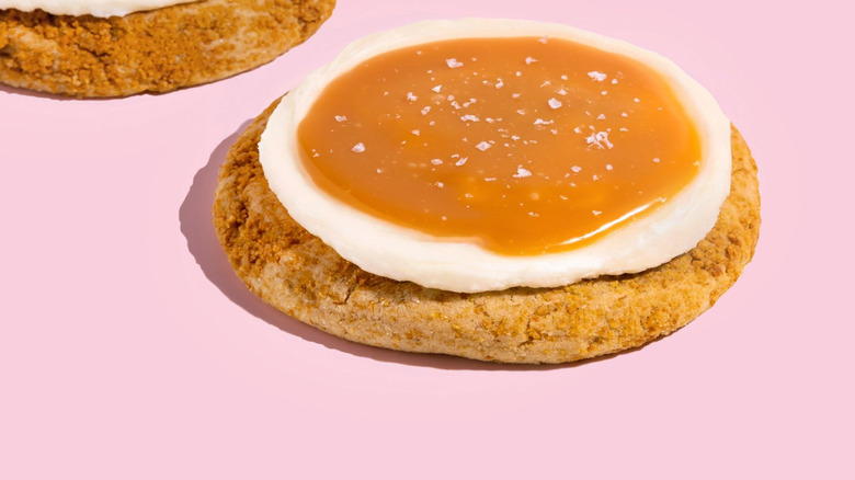 Crumbl's salted caramel cheesecake cookie first arrived on the menu in April, 2019, and it's appeared on both the regular menu and as a test cookie many times since. But, it's gone through some transformations throughout the years. Described as a three-layer stack of graham cracker, cheesecake frosting, caramel, and sea salt, the flavors have always remained with the delivery method tweaked by Crumbl.