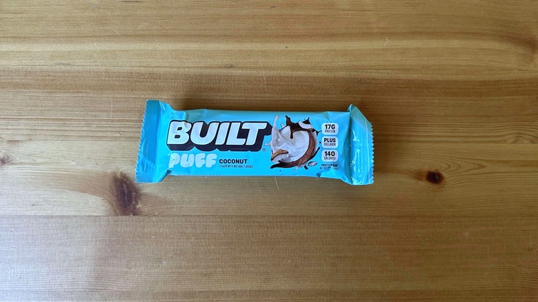 Out of all the bars featured on this list, Built Puff Coconut may just be the most interesting one in terms of texture. Instead of the mouth-filling density you'll get with some protein bars, this one boasts a much lighter texture, thanks to the sticky, gooey, coconut-flavored center. The almost gelatinous filling feels almost like a marshmallow but with more chewiness than you'd expect from those white, pillowy sweets. It's a texture we've never encountered in a candy bar before, let alone a protein bar, and we're absolutely here for it.
