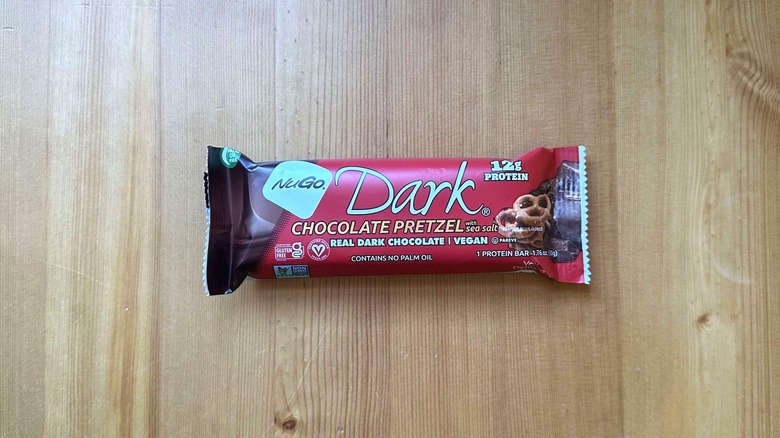 Just because you have a sweet tooth doesn't necessarily mean all you want is sugar, sugar, and more sugar. If you're looking for a more complex flavor profile — that won't leave you with a cloyingly sweet taste in your mouth — you may want to seek out NuGo's Dark Chocolate Pretzel with Sea Salt protein bar. This combines the salty and sweet snacks of your dreams, all in one well-balanced bar. You have a rich sweetness from the chocolate itself, but even that sweetness is tempered since it's not the typical, light, milk chocolate-flavored chocolate base you might imagine in a protein bar.