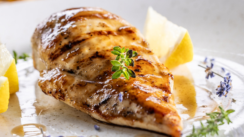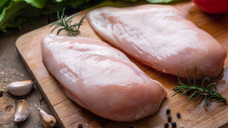 Of course, if masking the woodiness or improving its texture with acidic marinades doesn't appeal to you, the best bet is to avoid accidentally buying it in the first place. In this case, look for either organic chicken breasts — be warned, they will be a bit pricier than their non-organic counterparts — or smaller chicken breasts, which are less likely to be woody. Additionally, check the coloring. Look for a pale pink rather than a breast that is noticeably pale in color, and for meat that is smoother in texture when raw. Oh, and avoid buying the chicken breasts at Aldi, as they are known to be chewy.