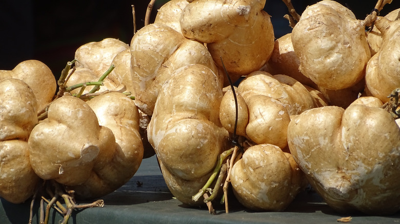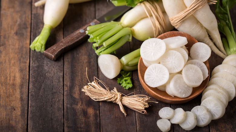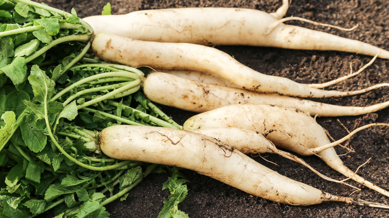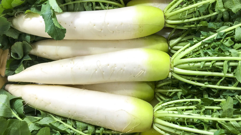 Jicama and daikon come from different parts of the world and belong to different vegetable families. So, they aren't related. And since they're from diverse regions, they are used for different cuisines. Before you substitute one for the other, it's also important to note which parts of each plant are edible, as one has multiple edible plant parts while the other is toxic except for the fleshy root. Let's explore the differences between daikon and jicama to see how they compare.