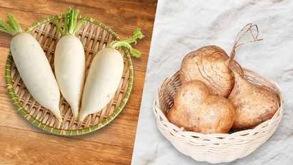 If you aren't very familiar with daikon, jicama, or both, you may find yourself wondering what the difference between the two is. Some recipes suggest that you can substitute raw jicama or daikon root for each other. However, we want to explore how they're different so that you know when that substitution might be a good idea and when it might not be.