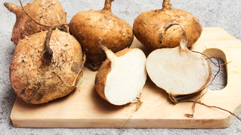 You'll often find jicama in regular grocery stores, but if you can't, check your local Latin grocery store. Like daikon, jicama is a root vegetable. Jicama's crisp and wet texture is one reason why it's often suggested as a daikon substitute. When looking for ripe jicama, you'll want to avoid any that have any skin blemishes or problems, as it can be a sign of disease or bacteria contamination. A dull color, abnormally thick skin, or soft spots can also be a bad sign. Be sure to keep them dry and unwrapped. While you can store them at cool room temperature for two or three weeks, they will last up to four months if kept between 55 and 59 degrees Fahrenheit.