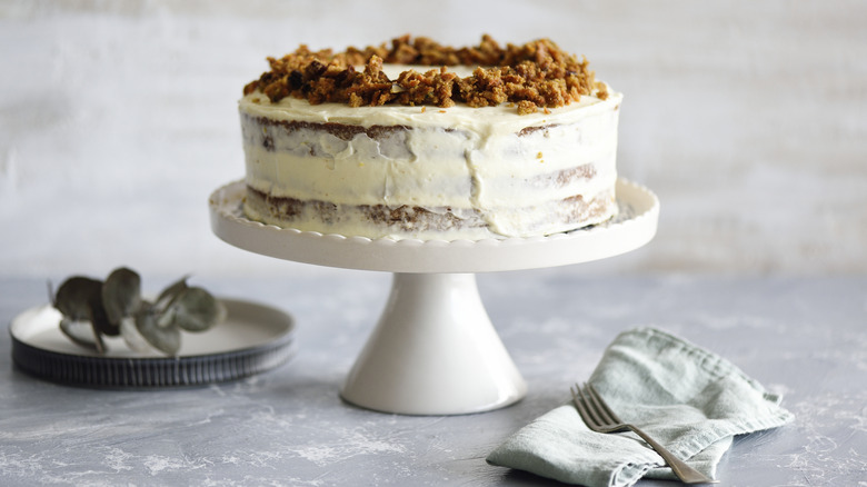 The baking part of making carrot cake is easy-peasy. But the decorating part is where issues start to arise. Regardless of whether you plan to pipe buttercream on the outside of your cake or to try a more naked cake design, you should always make sure the sponge of your cake is fully cooled before you start working. A warm sponge will cause the icing to slip and slide all over the place, which will not only make your dessert look messy, but it can also compromise its structural integrity — like if you're making a layer cake.