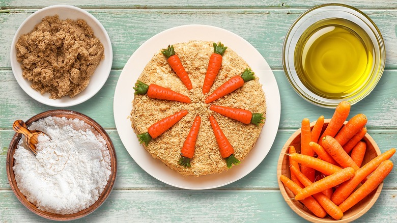 All-purpose flour is a staple ingredient that any baker should have in their kitchen. But, it's far from the only ingredient that should grace your recipes — including carrot cake. To take your carrot cake to the next level, consider swapping in part whole-wheat flour. While the nutritional differences between whole-wheat and regular flour are trivial, the latter does have a much nuttier flavor that will make your cake unique and tastier. The two flours also don't vary drastically in terms of their gluten content, so they are easy to swap and substitute.