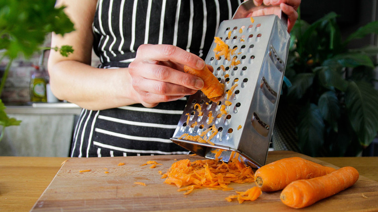 Sacrificing your knuckles is just part of the fun of making carrot cake, right? While there is a fair deal of groaning and "Are we done yet?" associated with grating carrots for this recipe, it's still an important step that you won't want to skip or do haphazardly. Ideally, your carrots need to be finely grated so that there are no chunks left over. The shreds, which you should always squeeze with a kitchen towel to remove the moisture from, should be able to disperse in your sponge and cook evenly. Large chunks of carrots simply won't do that, and it could mean biting into a piece of raw carrot.