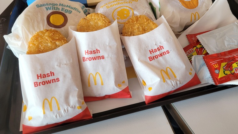 For this hack to work, you'll need to purchase two McDonald's hash browns. Unfortunately, all-day breakfast is no longer a thing, which means you can only order hash browns during breakfast hours. Depending on the location you visit, breakfast usually begins between 3 a.m. and 5 a.m. and ends between 10:30 a.m. and 11 a.m. The times vary because each franchise is allowed to decide on its hours and menu.