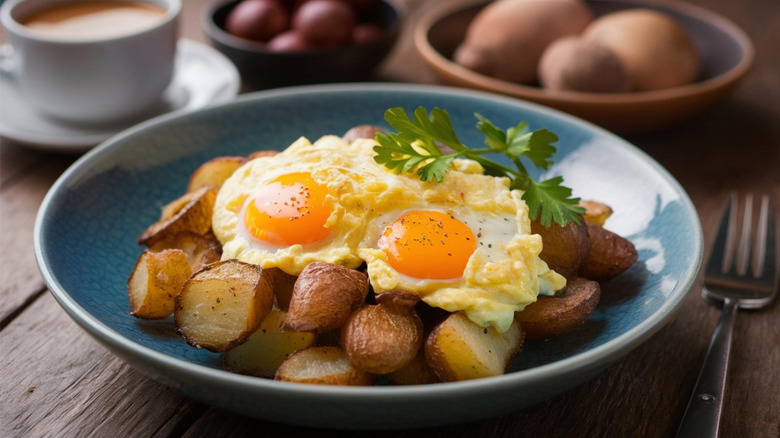 We have classics for a reason, and eggs and potatoes have a long-standing relationship where each party is fully aware of what they bring to the table and isn't threatened by each other's success. In eggs, you get protein and carbohydrates from the potatoes, and this dish (or its other iterations like American eggs and hashbrowns) has long been a favorite for good reason. To add some variety and health benefits, pair this dish with a refreshing salad for a very easy and speedy lunch.