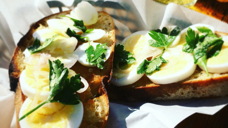 While simple, soft-boiled eggs are primarily eaten as a quick and easy breakfast (made even easier with the German invention eierschalensollbruchstellenverursacher, which roughly translates to "eggshell predetermined breaking point causer," or, more succinctly, an egg topper), there are many creative and much more elaborate egg offerings within German cuisine. Typically served for lunch or dinner over breakfast (or perhaps a leisurely brunch), these dishes combine the rustic charm of German country cooking with the elegance an egg dish naturally provides. Let's learn about these lesser-known German egg dishes straight from the experts so you can decide which ones you want to try at least once.
