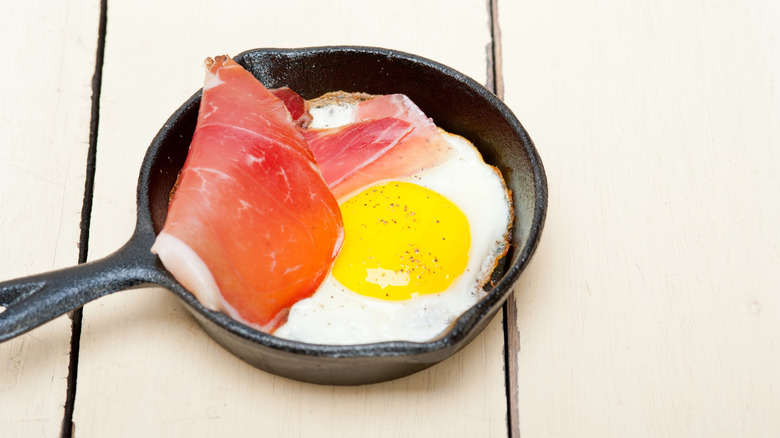 Strammer max's base starts with a thick slice of bread called graubrot or mischbrot, which means "gray bread" or "mixed bread." It's made from a mixture of rye flour, bread flour, and ground caraway seeds. German speck, a lightly smoked ham similar to prosciutto, is then added on top of the bread, and finally, a freshly fried egg completes the assembly. Think of this dish as a German relative to a bacon and egg sandwich.