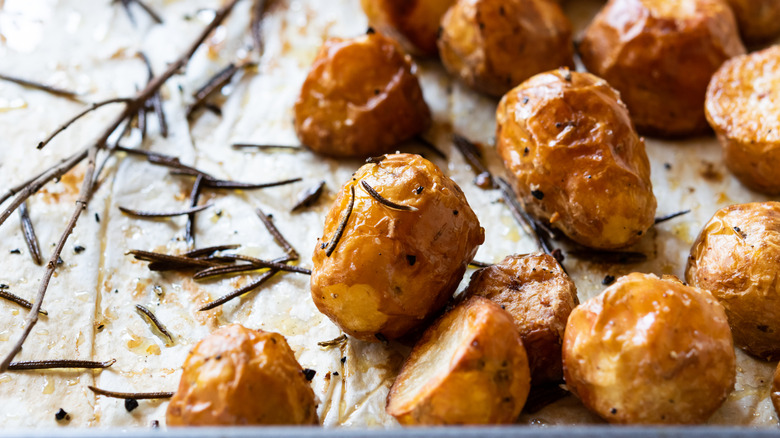 If you want flavorful roast potatoes that are fall-off-your-fork tender, there's a simple trick with aluminum foil that you should note. That's right, aluminum foil is the perfect kitchen tool to make your potatoes even tastier. This foil technique is easy: After warming a sheet pan in a preheated oven, add dried potatoes and spices before covering the whole thing with aluminum foil. Not only does this cook the potatoes, but it also traps the flavors in a confined space and locks them in, ensuring that the rosemary, garlic, pepper, and other spices and seasonings permeate throughout. Drying the potatoes well beforehand helps the skin retain its texture.