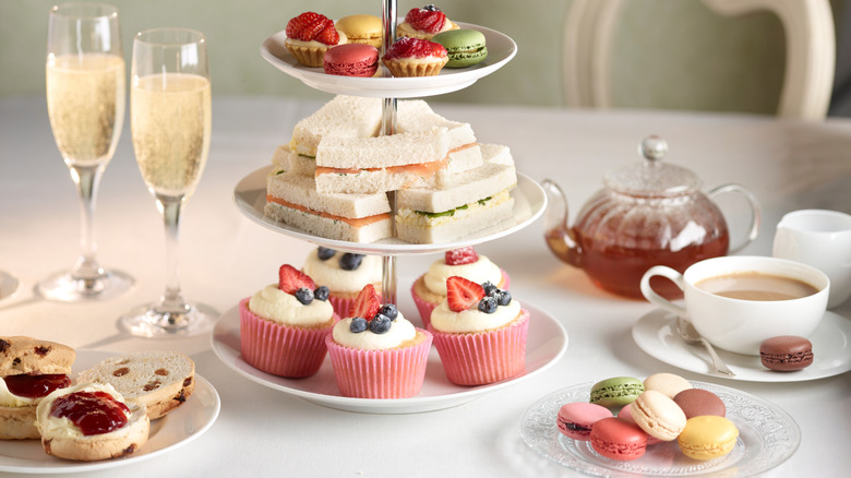 Good news for tea enthusiasts craving a grown-up midday aperitif: You can have it all. If you've ever sat down to a formal afternoon tea before, then you know it's an experiential dining affair. The tea consists of a three-course spread, opening with a traditional finger sandwich course (we're digging these spicy cucumber tea sandwiches with Calabrian chilis). This is subsequently followed by a scone course and a final pastry course including treats like cupcakes or tarts. If that sounds like a lot of one-note sweetness, the scones can be savory, like these tomato pesto scones. On a tri-tier cake stand, the sandwiches are customarily placed on the bottom tier, with the scones placed in the middle and the pastries on the top tier. Nothing is missing from this elaborate lineup... except for maybe a little spirit.