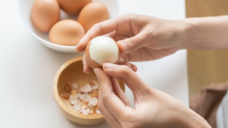 You know the saying: Breakfast is the most important meal of the day. It's a controversial statement nowadays, with some researchers suggesting that those who skip out on breakfast aren't missing much, especially if they get necessary nutrients throughout the day. However, we still think breakfast is critical to getting your day started on the right foot, and one of the best ways to do so is by making sure your meal has plenty of protein. Whether you like them soft or hard, boiled eggs are ideal for those who are on-the-go but who don't want to pass up on a protein-packed breakfast. You can make them ahead — and peel them, too — to make things super easy for yourself. However, if you decide to do so, you'll want to ensure that your peeled eggs are stored correctly in the fridge so they don't dry out and go bad.