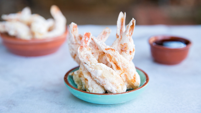 - Dip each shrimp into the first bowl of wet batter, let them drip, and then dredge them in the second bowl of flour to seal the batter. Set the shrimp aside on a dish. Give the shrimp a second pass in the flour if they still look wet.