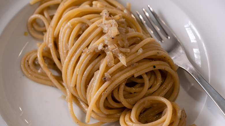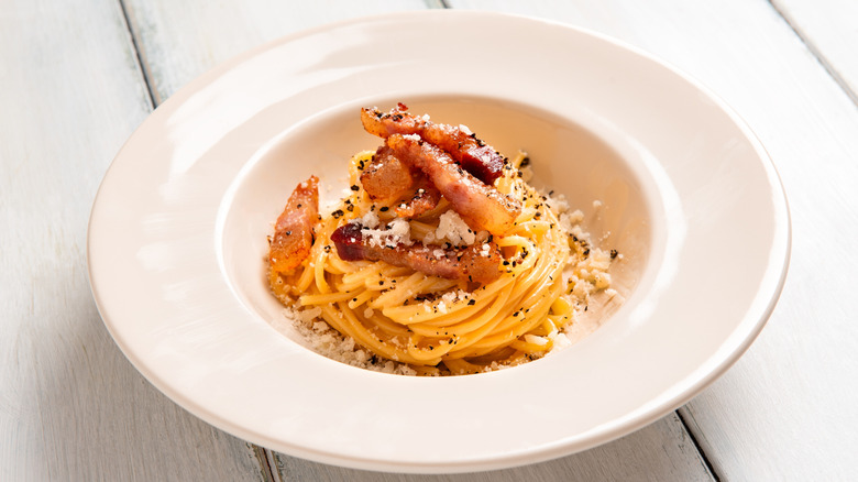 The dish's origins are unclear, either coming from the town of Grisciano (the Roman word "gricio" meaning someone who sells basic food staples) or from a recipe prepared by shepherds who traveled with few ingredients. Either way, it appears to be a predecessor of carbonara, which also contains eggs. Although similar, spaghetti alla gricia isn't quite so heavy, thanks to the omission of eggs and less cheese compared to cacio e pepe. The two ingredients shine in tandem, proving that you can do a lot with very little.
