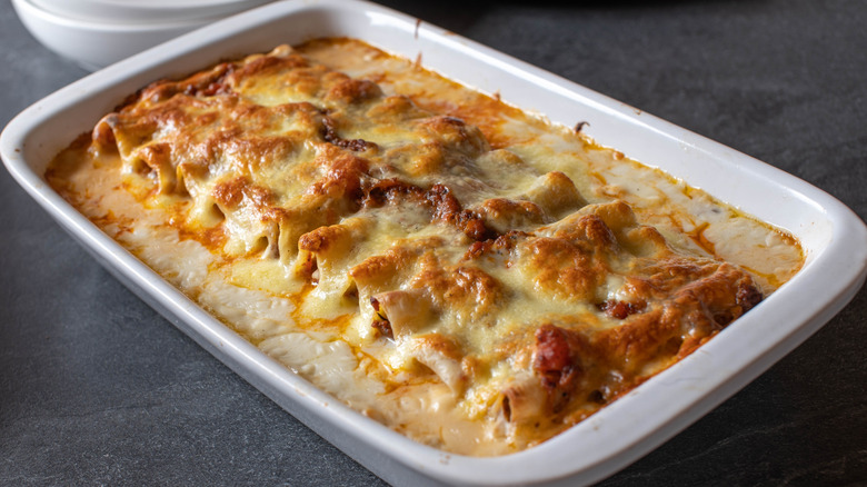 The filling is up to the discretion of the chef and the region, but traditional recipes often call for a ricotta and spinach blend, meat ragu, mozzarella, or ricotta and ham. Then, the loaded pasta tubes get covered in either a Parmesan-flavored bechamel or tomato sauce before baking in the oven. Of course, nothing's stopping you from experimenting with the filling and toppings.