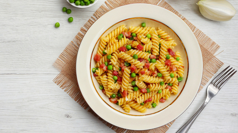 Canned peas might not be the most inspiring ingredient, but eat them fresh and it's another story. Peas ("piselli" in Italian) grow commonly in central and southern Italy, making them an easy ingredient to add to pasta to give the dish a pop of color and a burst of sweetness. Small shapes are often used for this recipe, such as farfalle (aka bowties), macaroni, fusilli, or ditalini (short cylinders).