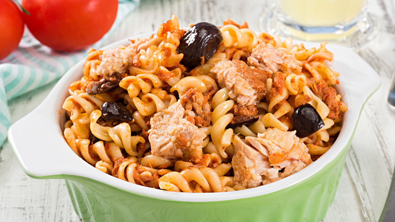 Tuna canned in olive oil is a must, and other add-ins can include briny capers, olives, anchovies, minced onions and garlic, lemon zest, and Calabrian chili peppers to add a kick. Some versions feature diced tomatoes or tomato puree, while fresh basil or parsley add bright, herbaceous flavors to this simple seafood pasta. Even better, some recipes top it with toasted breadcrumbs, adding a delightfully crunchy texture to every bite.