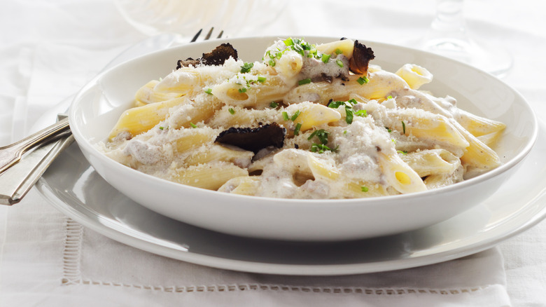 Some variations add freshly grated black truffles as a garnish when they're in season, though that might not be as feasible if you're preparing this at home. (Truffle oil is not a suitable swap here, as it will overpower the subtle notes of the dish.) Instead, a sprinkling of nutmeg infuses the sauce with warmth and a hint of peppery spice. Tube-shaped pasta works well here, allowing the velvety sauce to find its way into all the hollows.