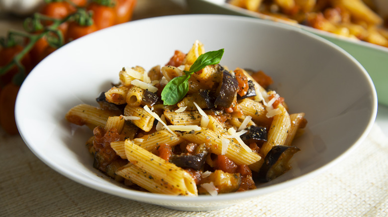 Pasta alla Norma consists of roasted, fried, or sauteed eggplant, along with either fresh or canned tomatoes. The tomatoes form the base of an easy garlic, herb, and chili sauce, which is then tossed with the cooked eggplants and served with boiled pasta. Fresh basil or parsley leaves and ricotta salata are a must for the garnish, though the latter can be swapped with pecorino cheese if you can't track it down. Thicker tubular pasta shapes are a good choice here, but spaghetti works too.