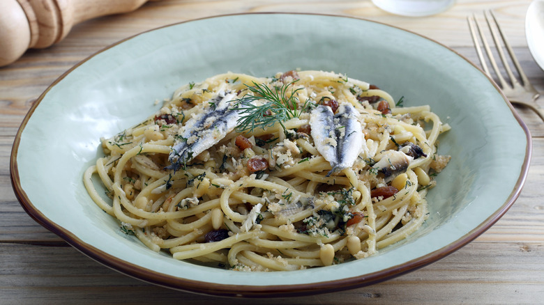 This savory seafood dish highlights sardines front and center, and it's a far cry from the sad can that's been sitting in your pantry for years. Typically, fresh sardines are used in this Sicilian recipe, though quality tinned fish can be substituted too. Fennel greens add a vegetal touch to the dish, while toasted breadcrumbs bring a textural contrast to the palate.