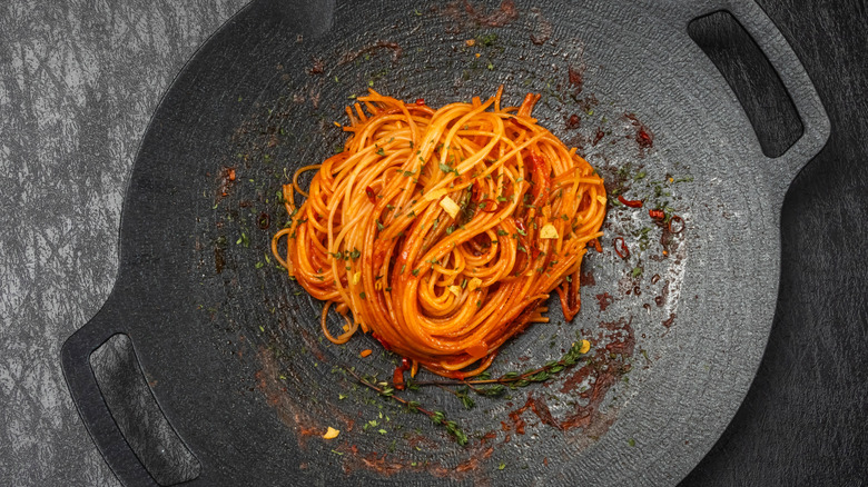 The easy preparation consists of spaghetti with tomato paste, sauce, and dried chili peppers, cooked in a pan until some of the pasta starts to get crispy and browned. The level of crunch, char, and heat varies depending on the chef, as people have pretty staunch beliefs regarding the ideal balance. Although it originated from a single restaurant, this savory pasta dish is spreading around the world.