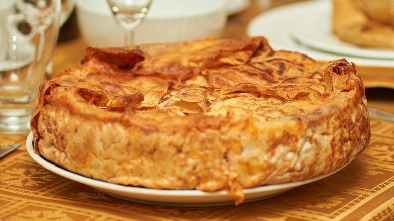 If you think baked pasta dishes only encompass classics like lasagna and mac and cheese, think again. Timballo is a delicious dish that's sure to impress your family and dinner party guests alike with its cake-like appearance. Also known as timpano, the multilayered preparation is worthy of a feast and likely dates back to Naples in the 18th century, where it was prepared to use up leftovers. Typically baked in a springform pan, the concoction consists of meat, vegetables, eggs, sauce, cheese, and pasta (often macaroni) wrapped in more pasta.