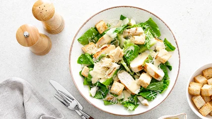 You can apply the grilling method to other proteins, too. Grilled salmon can be a wonderful addition to a Caesar salad, and, if you prefer a plant-based option, grilled tofu pairs well with our genius vegan Caesar salad dressing. As a final testament to how much we love the grill (and since you're already using it), try tossing the lettuce on as well. Pick a fresh, crispy romaine, slice it in half, and grill for a few minutes on each side. It might sound odd at first, but we promise that your Caesar salad will taste better with this hack.