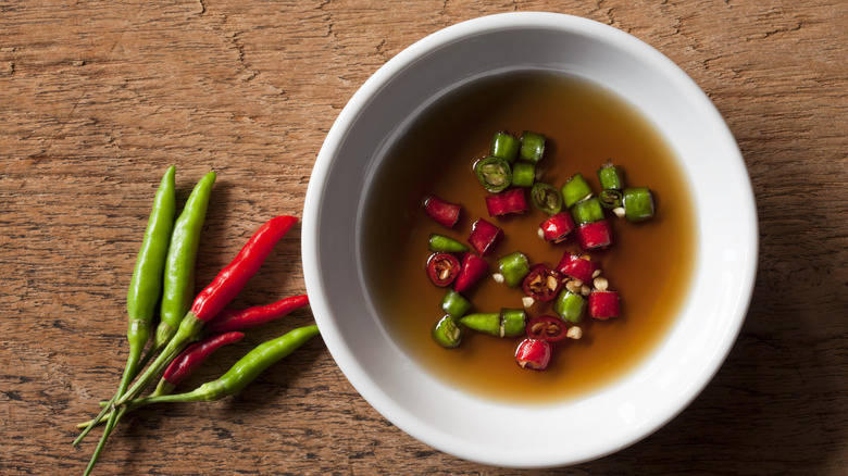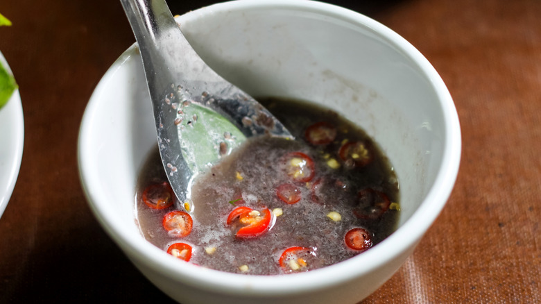 To be clear, there are many other varieties of fish sauces from countries like Cambodia, Japan, and Korea, but the types from Vietnam and Thailand are the most used so that's what we're comparing here. Vietnamese sauce, known as nuoc mam, hinges on anchovies and salt. Meanwhile, the Thai version, called nam pla, also contains fermented fish like anchovies. When you compare the two, Thai fish sauce usually exhibits a stronger flavor and darker color than the one from Vietnam. Both can be used in place of the other, but the differences are still important to know, home cook.