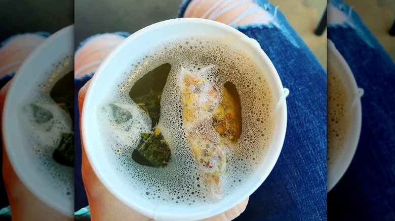 If you like fruit-forward teas or peach-flavored products, then you're bound to appreciate the Iced Peach Green Tea Lemonade. This drink is a harmonious mixture of peach-flavored juice, spearmint, lemon verbena, lemongrass, and lemonade as the star of the show. These delights get poured over ice for a marvelous sipper that you'll down immediately after sampling that first gulp. We think the tart lemonade and sweet peach work well to craft a refreshing drink ideal when you don't want a lot of caffeine — the combination comes in at around 30 milligrams of caffeine.