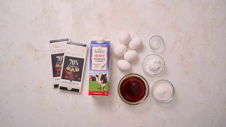 To begin, you'll need high-quality chocolate chopped into small pieces. Avoid baking chocolate, which is unsweetened, and instead seek out 70% cocoa chocolate bars, which melt smoothly and have a rich chocolatey flavor. In a pinch, you can also use chocolate chips. From there, you'll need 5 eggs, separated, as well as granulated sugar, salt, heavy whipping cream, powdered sugar, and brewed coffee. We recommend brewing a strong cup and letting it cool, but you can also use espresso for extra coffee flavor, or use cold brew if you don't have a means to brew fresh. To garnish, you'll need about a tablespoon's worth of espresso powder and shaved chocolate — which you can repurpose from the ingredients you have left over after making the mousse.