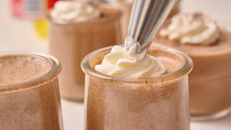 - To serve, top with the remaining whipped cream, espresso powder, and chocolate shavings.