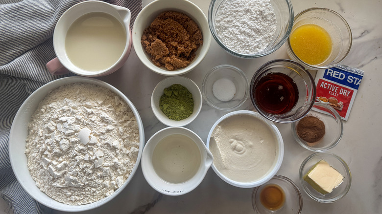 Gather the ingredients for matcha cinnamon rolls with cream cheese frosting
