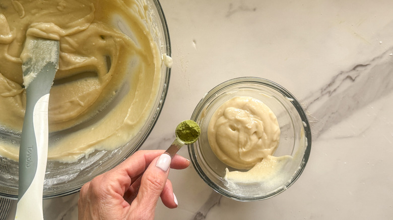 - In a large bowl, stir the flour, 2 tablespoons matcha powder, and salt.