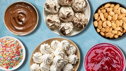 Two meringue cookies are better than one! Take your meringue game to the next level by using meringues to make hand pies. Start by piping and baking perfectly shaped meringue cookies with flat, gap-free bottoms to ensure a snug fit. Once the cookies are cooled, the true decorating touch lies in the filling. Spread a decadent layer of buttercream between the cookies and add a playful touch by rolling the edges in colorful sprinkles or toasted nuts. If buttercream isn't an option, you can swap it for fruit preserves, zesty lemon curd, or rich chocolate ganache.