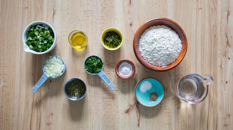 For this recipe, you will first need olive oil, onion, scallions, and fresh parsley, mint, and chives. Have all-purpose flour, baking powder, salt, and black pepper on hand for the batter. Finally, sparkling water is used to help make the pancakes fluffier, but you can use flat water if needed.