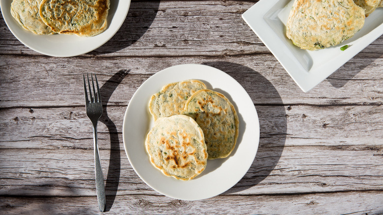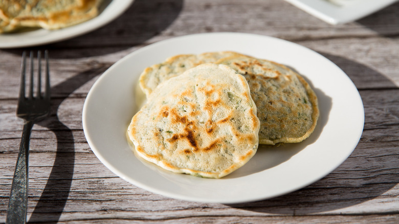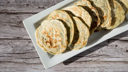 Recipe developer Michelle Bottalico has created a recipe for savory Greek kremydotiganites that's aromatic and tasty. Onions and scallions are first sauteed in olive oil before being mixed with herbs and folded into a simple batter of flour and sparkling water. This naturally plant-based recipe doesn't contain eggs, and sparkling water is an unexpected pancake ingredient that helps the batter to rise and makes the final result fluffier.
