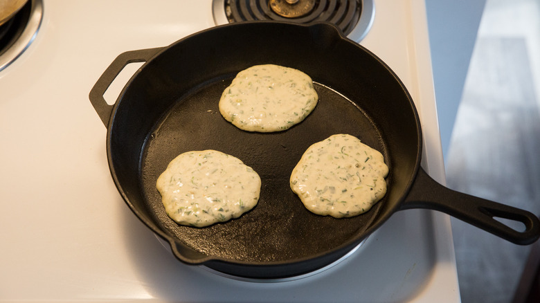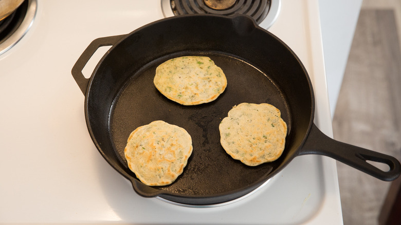 - Heat a small amount of oil on medium in a large cast iron or nonstick pan.