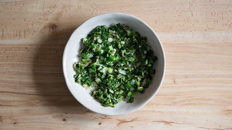 - Stir the herbs into the pan and transfer the onion mixture to a wide dish and set aside to cool, about 10 minutes.