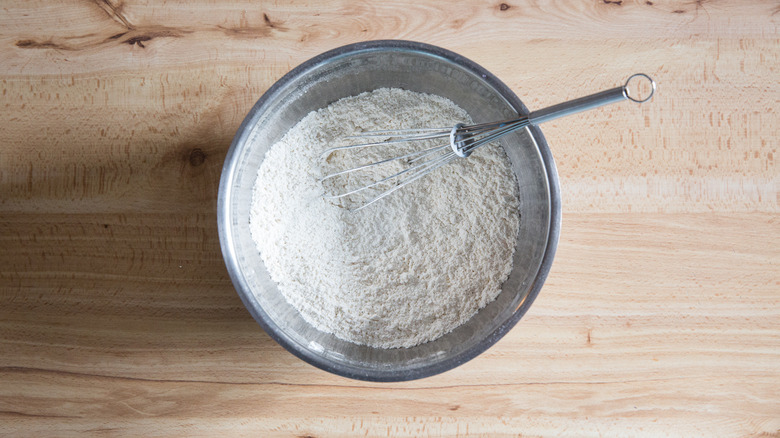- Place the flour, baking powder, salt, and pepper in a mixing bowl and whisk to combine.