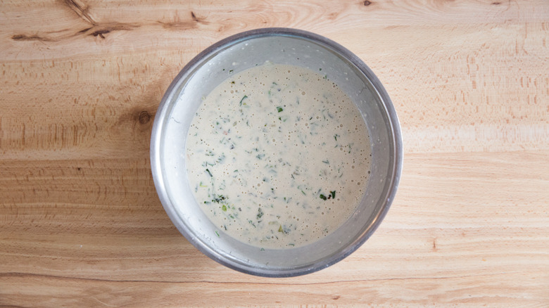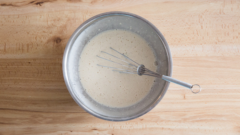 - Pour 1 ¾ cup of the sparkling water into the bowl while whisking continuously until a thick, smooth batter forms.