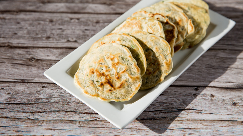 While kremydotiganites are savory pancakes filled with onions and herbs and sometimes additional ingredients such as cheese or olives, there are also sweet versions called tiganites that are closer to what Americans may recognize as pancakes. Tiganites have a base of flour and water and have a neutral taste on their own, which is why they're served with sweet toppings to add flavor. They are traditionally served as a dessert topped with sugar, honey, fruit syrup, dried fruit like raisins or figs, citrus zest, or cinnamon. Today, however, some cooks prefer to serve a richer version with toppings such as chopped nuts and whipped cream.
