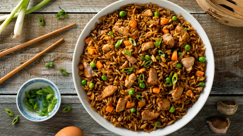 On their own, the leftover pork chops' lackluster taste might be really apparent, but you won't notice it as much when surrounded by the many ingredients in a fried rice dish. The umami condiments also coat them in a brand new layer of flavor that brings out their original savory richness once again. It may not be as pronounced as it once was, but when it's laced with a hint of caramelization and packing a delightful crunch, you'll barely notice the difference. After all, pork is the absolute best and most popular protein for fried rice.