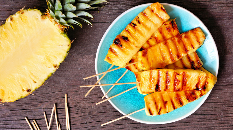 Clay Brand Jr., who's a big fan of grilled fruits in general, says of his prep, "I cut the pineapple into strips and coat it with a mixture of brown sugar and cinnamon before grilling." Though, he adds, "It might be better baked because the pineapple cooks in the juices." In addition to leaning into the pineapple's natural sweetness, one trick for grilling fruit includes adding a bit of spice to your sweet and smoky creation by sprinkling on a touch of chili powder, Tajín, or cayenne pepper.