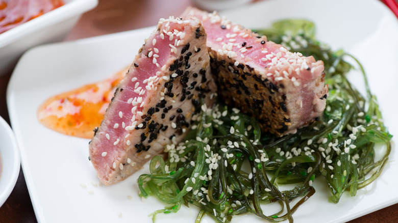 Seaweed salad can add a range of gestures and flavors to your tuna steak meal. It may rank highly for some, as it's said to offer a long list of nutritional benefits, from stabilizing blood sugar to improving heart and gut health. For Clay Brand Jr., it's a side dish that's almost too good to be true, as he jokes, "I think seaweed salad was created in a laboratory for me." He explains, "I'm not sure that there's another dish that does it all so well. The seaweed itself has a pleasant umami flavor. The dressing sweet, salty, and bright."