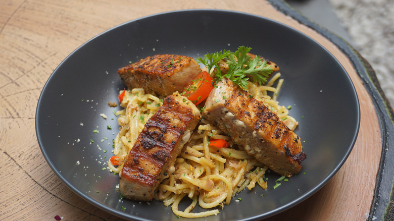 Anyone with young kids knows the convenience of having pasta hanging around the cupboard. And while pasta with olive oil is a slightly more benign side dish in both aroma and taste, it will work well for highlighting your tuna steak's flavors. And just like your tuna steak, spaghetti or linguini aglio e olio is easy to work with, reinvent, and expand on. "You can make almost anything look nice if you're willing to take the time," Brand explains. "That's really important in my house — I think it's worth taking the extra time to make sure dinner looks great."