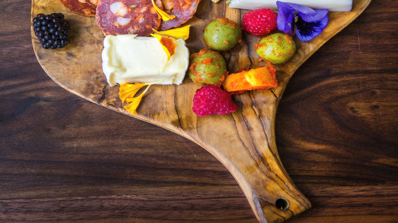 Your charcuterie board should look as good as it tastes. As such, you may want to consider adding a ton of colorful and edible decorations to your board. While these items don't offer the same sustenance as your meat, cheese, and crackers, they will still add color and cool design elements to your display. For example, Evan Inada suggests adorning a wedding board with sugared fruits, fresh herbs, and edible flowers. These might include rosemary sprigs and candied citrus slices, which Inada claims adds "both beauty and aroma to the board."
